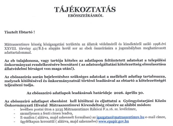 Tájékoztatás ebösszeírásról / 2026.03.30. admin küldte be 30 March 2026 időpontban Tájékoztatás ebösszeírásról Adatlap ebösszeíráshoz