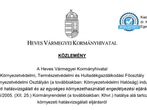 A DIGITROLL Kft. (4200 Hajdúszoboszló, Bánomkerti út 63., KÜJ:100802610) meghatalmazottjaként eljáró TRENECON Tanácsadó és Tervező Kft. (1133 Budapest, Váci út 76. VI. torony, 3. emelet) a Heves Vármegyei Kormányhivatal Környezetvédelmi, Természetvédelmi és Hulladékgazdálkodási Főosztály Környezetvédelmi Osztályára (a továbbiakban: Környezetvédelmi Hatóság) benyújtott kérelmére indult környezeti hatásvizsgálati eljárásban, a környezet védelmének általánosszabályairól szóló 1995. évi LIII.