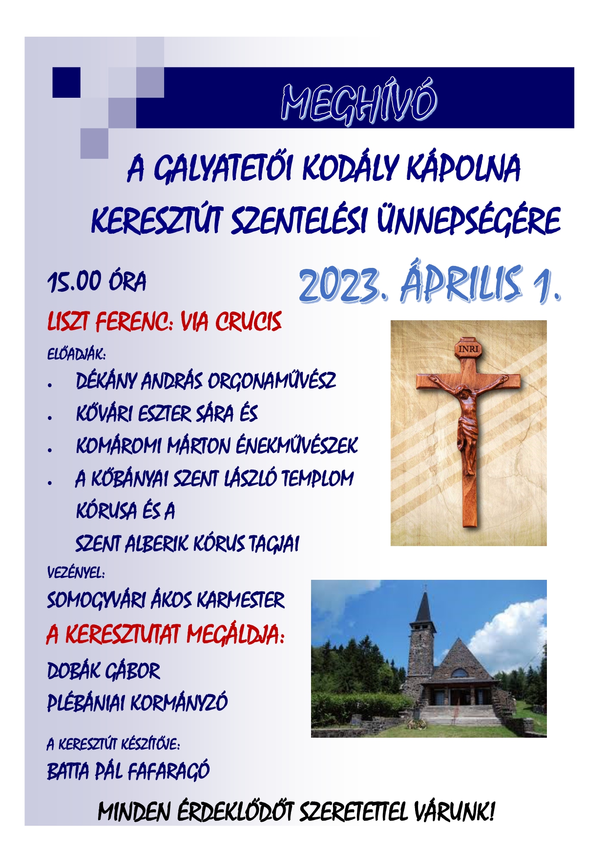 A galyatetői Kodály Kápolna keresztút szentelési ünnepsége / 2023.03.21. szerkeszto küldte be 21 March 2023 időpontban Április 1-én várunk mindenkit nagy szeretettel a Galyatetőre, a kápolnához.