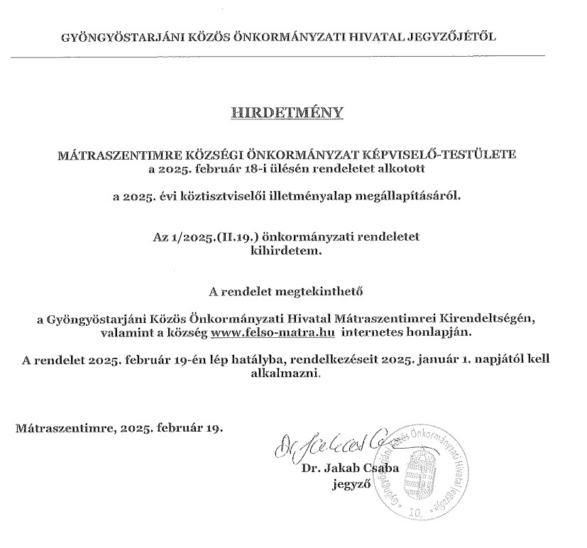 Hirdetmény - 1 2025. (II.19.) 2025. évi köztisztviselői illetményalap megállapításáról Közzétételek / 2025.02.26. admin küldte be 26 February 2025 időpontban