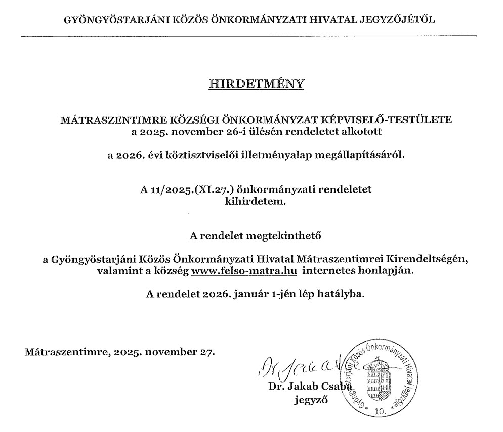 Hirdetmény a 2026. évi köztisztviselői illetményalap megállapításáról / 2025.12.10. admin küldte be 10 December 2025 időpontban