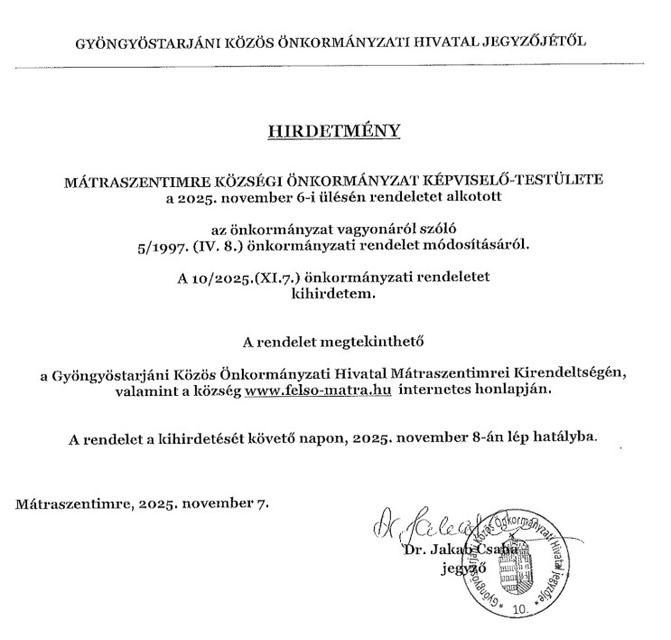 Hirdetmény - Vagyonrendelet módosítás / 2025.11.10. admin küldte be 10 November 2025 időpontban hirdetmeny-vagyonrendelet-modositas.pdf