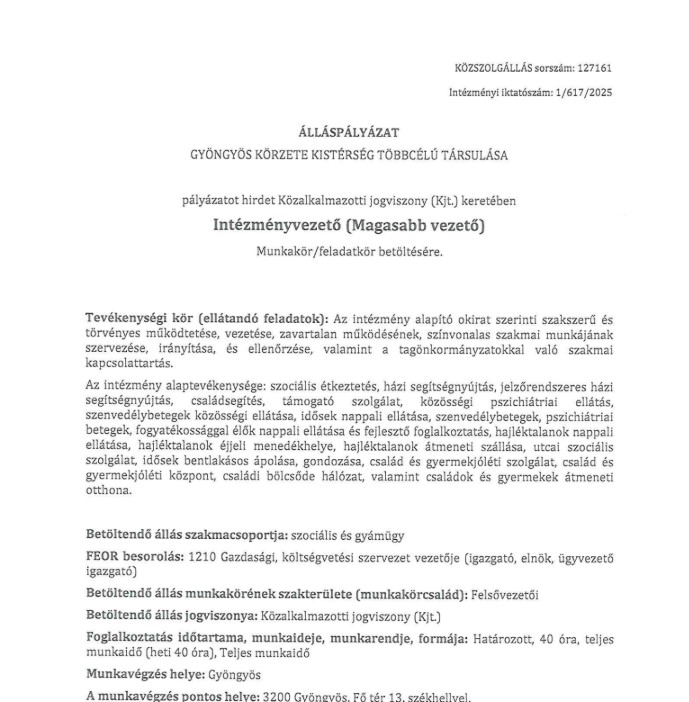Intézményvezető álláspályázat / 2025.09.04. admin küldte be 4 September 2025 időpontban https://kozszolgallas.ksz.gov.hu/JobAd/Info/127161 allas_szemvezeto.pdf