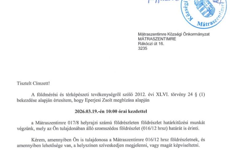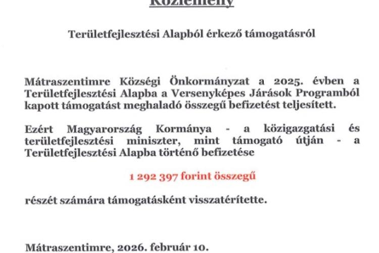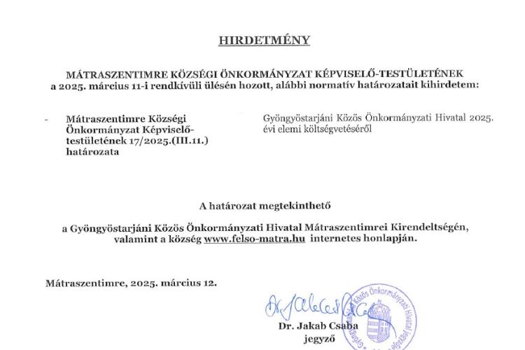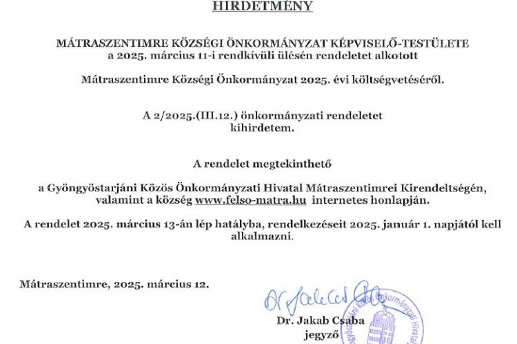 Hirdetmény a Mátraszentimrei Községi Önkormányzat 2025. évi költségvetéséről