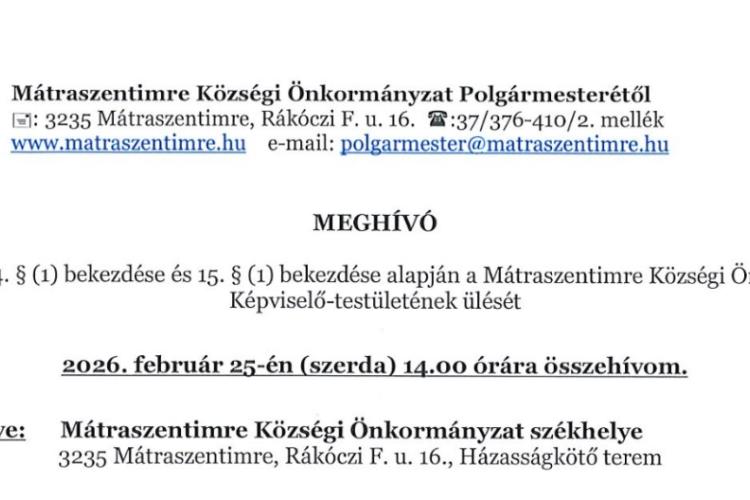 Meghívó a 2026. 02. 25-i Képviselő-testületi ülésre