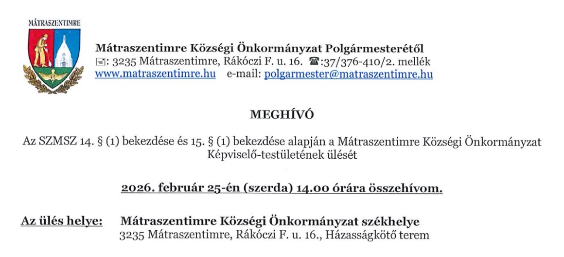 Meghívó a 2026. 02. 25-i Képviselő-testületi ülésre Meghívók / 2026.02.22. admin küldte be 22 February 2026 időpontban Meghívó a 2026. 02. 25-i Képviselő-testületi ülésre