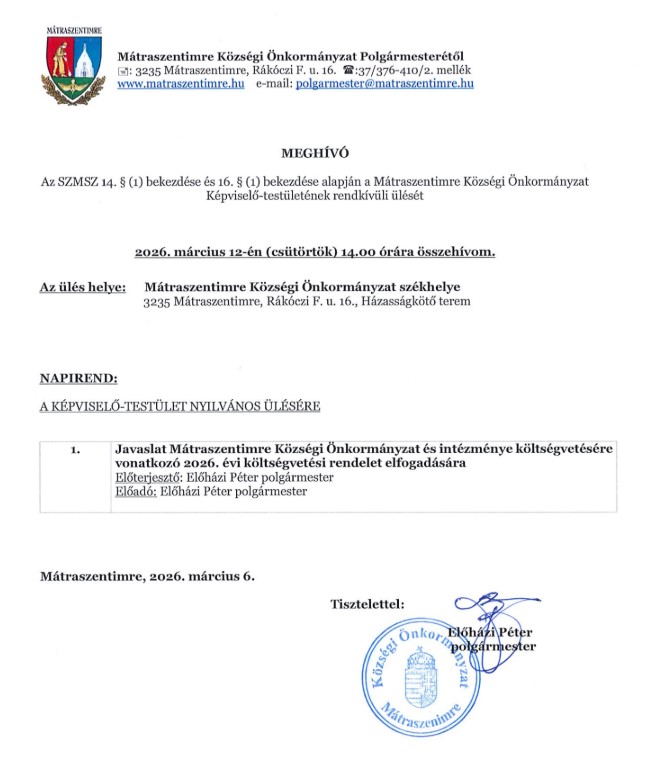 Meghívó a 2026. 03. 12-i Képviselő-testületi ülésre Meghívók / 2026.03.07. admin küldte be 7 March 2026 időpontban Meghívó a 2026. 03. 12-i Képviselő-testületi ülésre